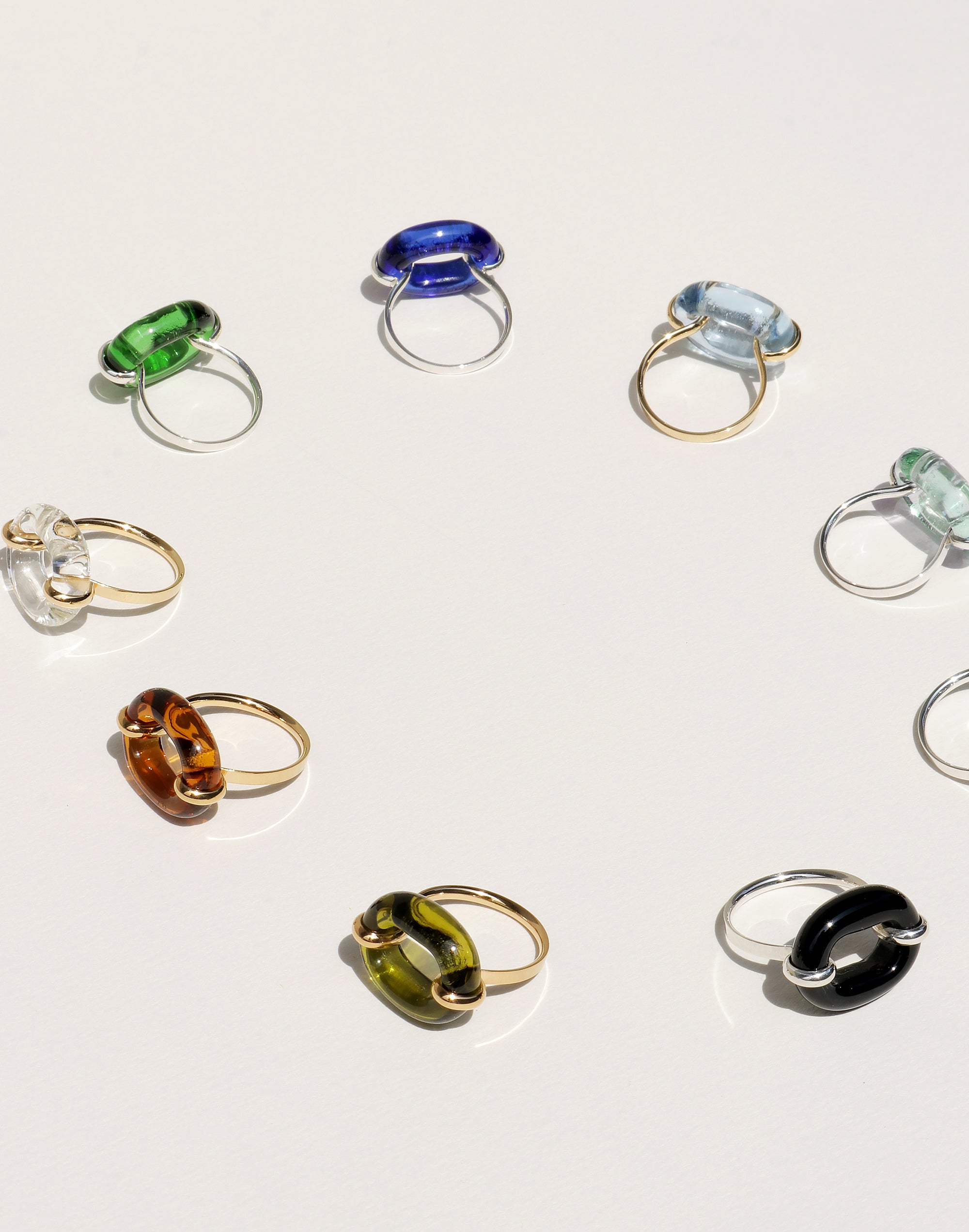 Our signature In The Loop Rings are crafted from discarded glass. Circular, sculptural, and shaped with care. Designed to turn waste into something meaningful.