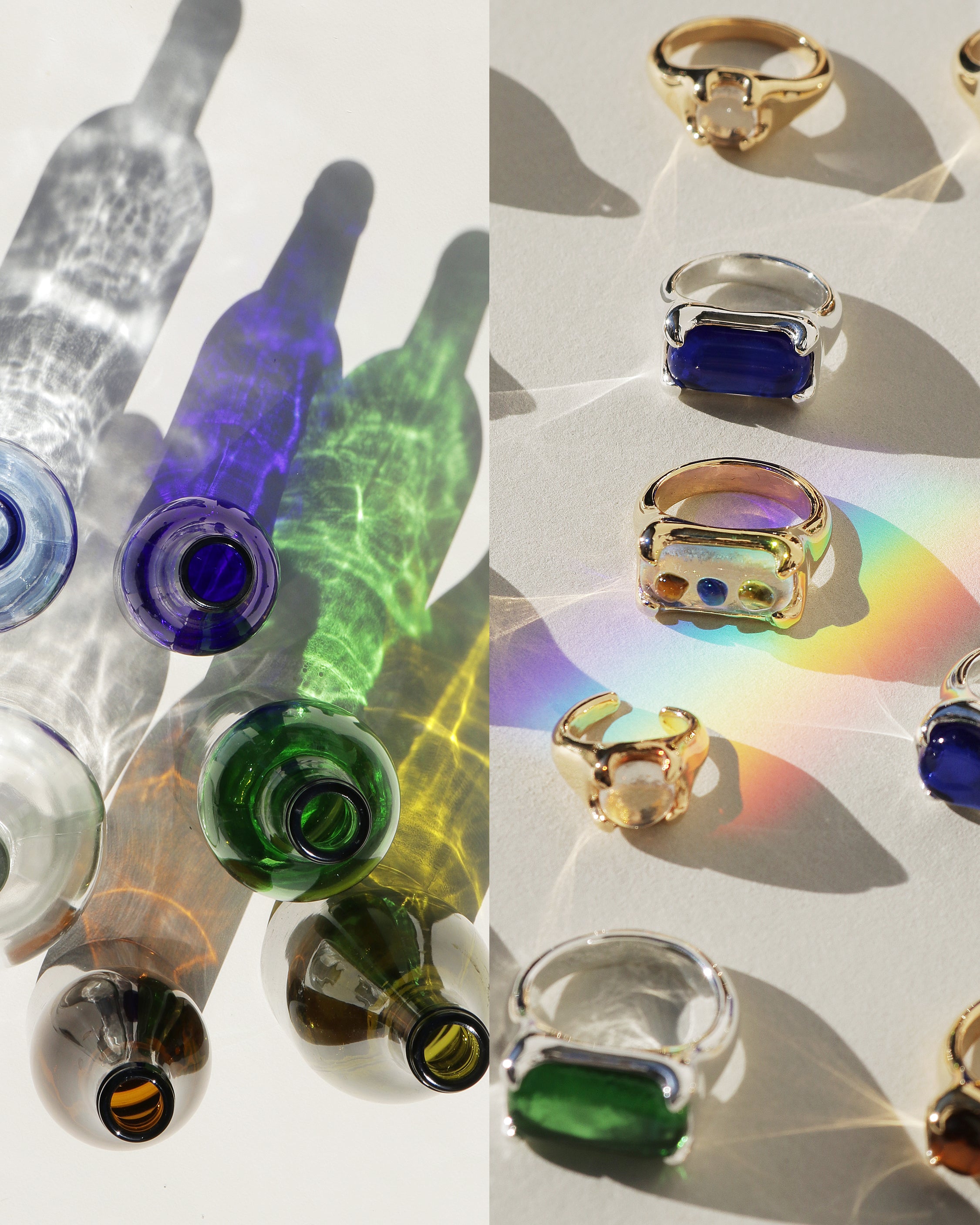 Spectral colors that shine when a prism catches the light at a precise angle are a beautiful sight to see, just like a rainbow. This collection represents our interpretation of the colors we see from this natural phenomenon through CLED eco gems upcycled from discarded glass.