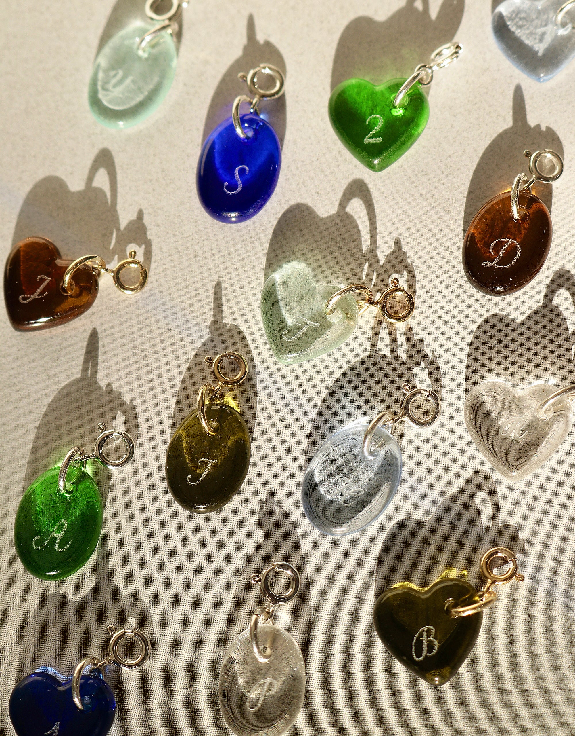 2. Each icon charm is cut from the discarded glass bottles, then the edges are sanded, and the glass is formed and annealed in the kiln.