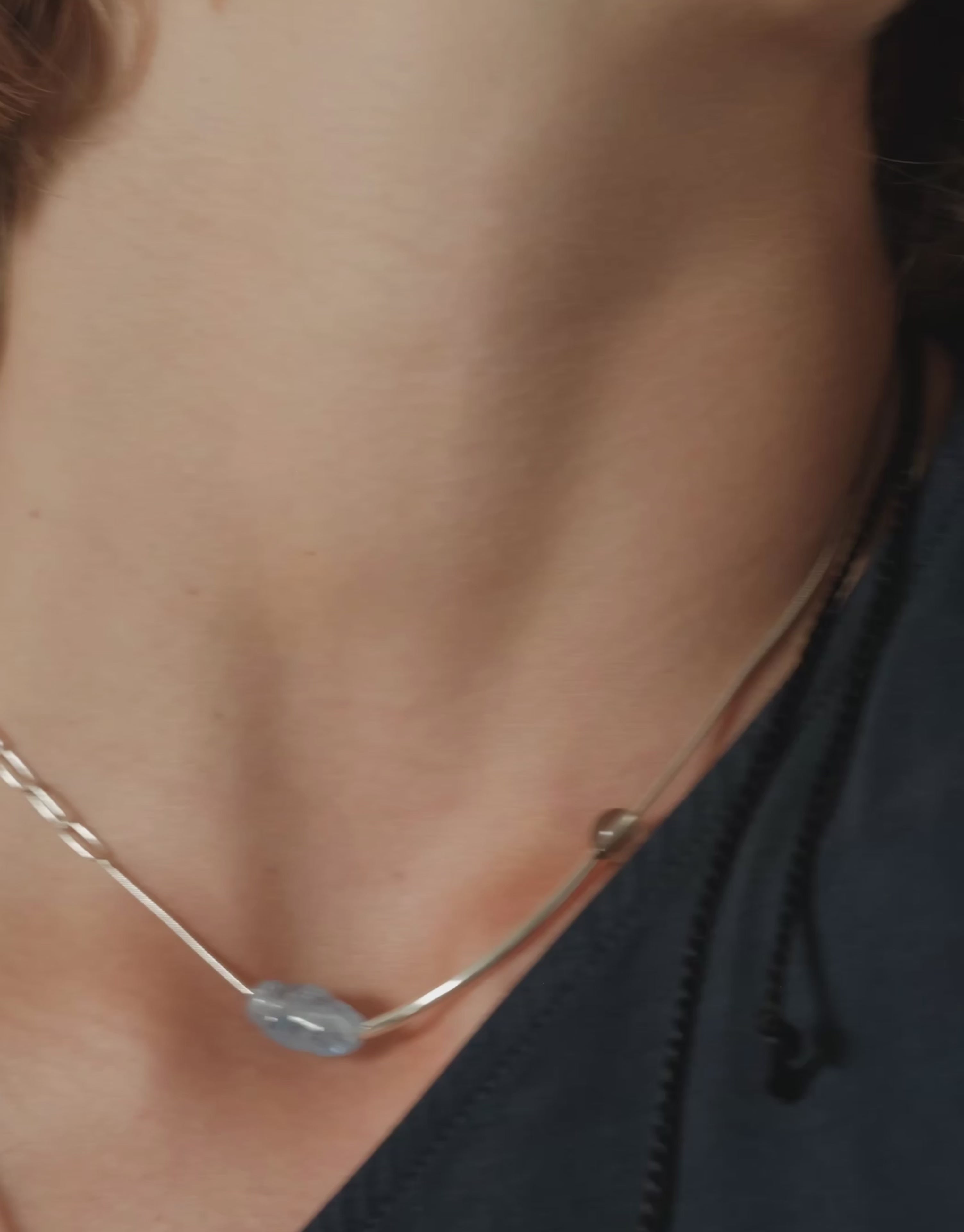 Still Necklace blends soft rhythm and contrast through fluid silver curves, delicate chain links, and hand-shaped glass beads. Its asymmetrical design reflects a quiet sense of movement and balance, like a slow breath or a gentle wave. A minimal yet expressive piece to wear with ease.
